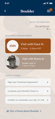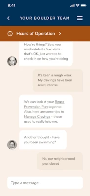 ON-DEMAND VIRTUAL CARE, ACCESSIBLE ANYWHERE: Access treatment on your schedule, with no more waiting rooms or long trips to a clinic. Boulder’s telehealth program is delivered entirely virtually, through secure on-demand video visits and messaging in our smartphone app.