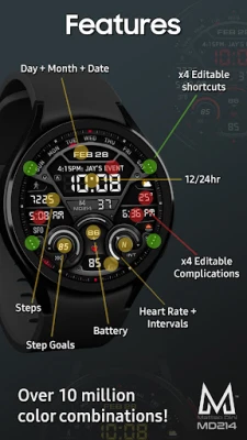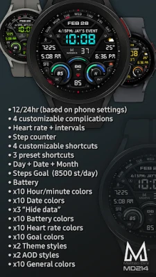 - Changeable colors of hour+minutes, seconds, hide data, themes, battery, heart rate, goal, AOD styles and general colors.
