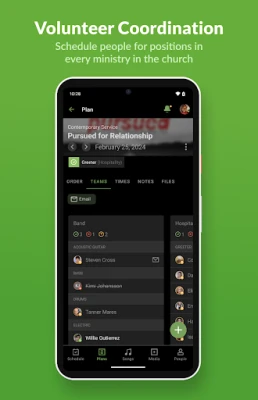 With our native Android app, you get an optimized Planning Center Services experience wherever you are! You can manage your schedule, accept or decline requests, blockout dates, or upload your profile picture. Musicians can use the built-in media player or attachments section to access and rehearse their music. Schedulers can add users to schedules, check for conflicts, and email their teams at any time. Easily add to, reorder, and edit your plans.