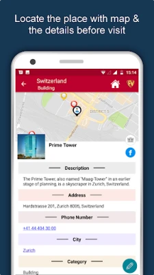 Apart from this, Switzerland Travel & Explore guides you Why, When and How to visit various places in Switzerland with precise location on the detailed Map. There are three ways to explore this app - Category view, City view and EduBank favorite places view. Pin your destinations and get the routes on the Map. Not only this, you can see exactly how the places look like with Street View integrated in this app. The app also has a feature to Rate and write Review/Experience regarding entity(s) through Login. Your Travel experience and rating will help the user community.